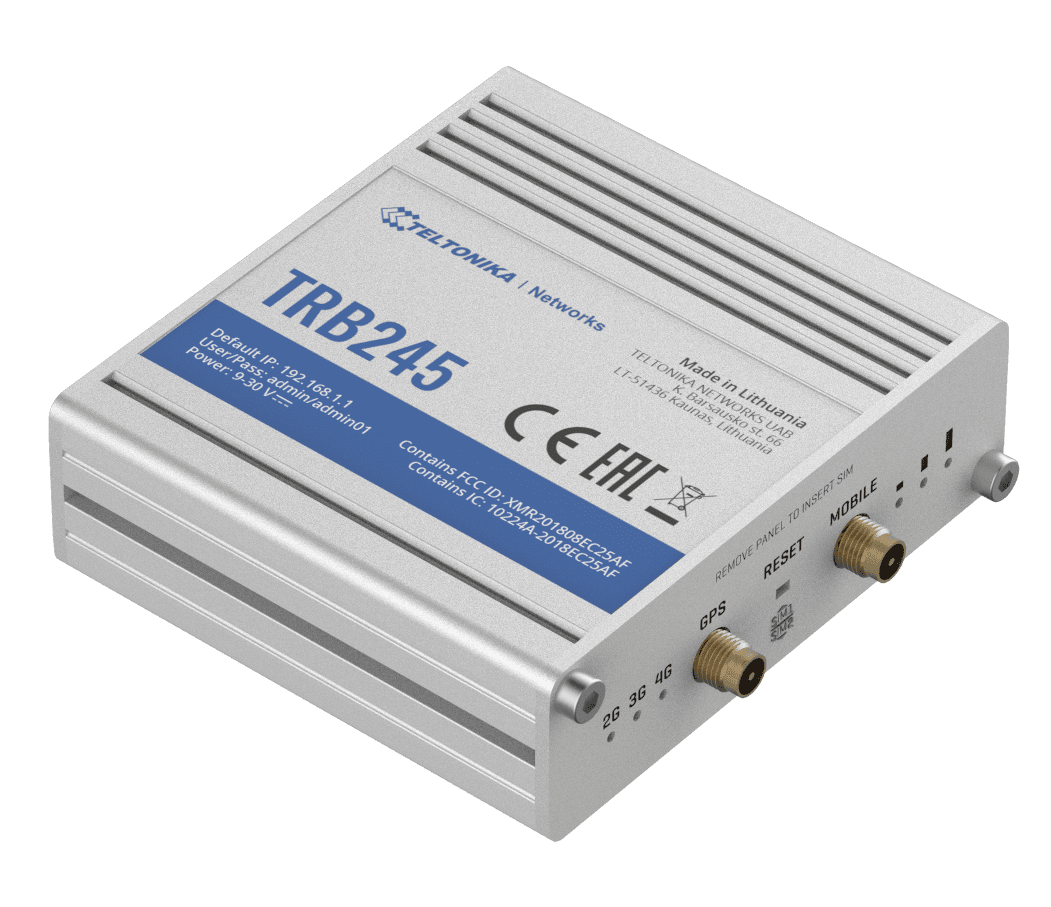 The TRB245 industrial LTE Cat 4 gateway packs all essential features for any industry: fast and reliable internet connection, combination of Ethernet and serial communication, secure power connector, I/O ports, and time synchronization services. It can be used to integrate modern and legacy industrial equipment in one solution via RS232 or RS485 interfaces. The TRB245 ensures that data can be reached securely with a wide range of software features like SMS control, Firewall, OpenVPN, IPsec and RMS. The dual SIM functionality with auto-failover and a backup WAN ensure stable connectivity even if the primary connection is lost